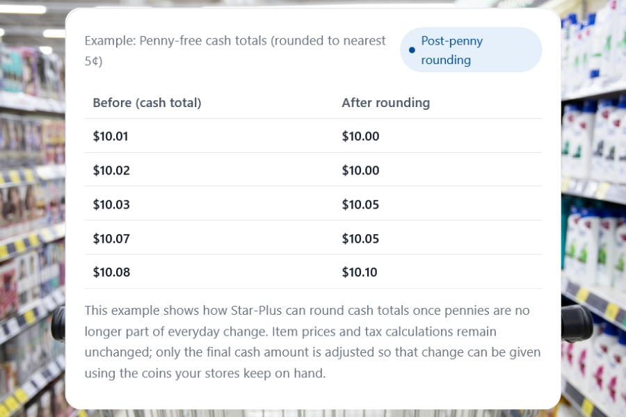 Penny rounding in Star-Plus is the ability to adjust the final cash transaction total to match the smallest coin your stores plan to use once pennies are no longer part of day-to-day cash handling.